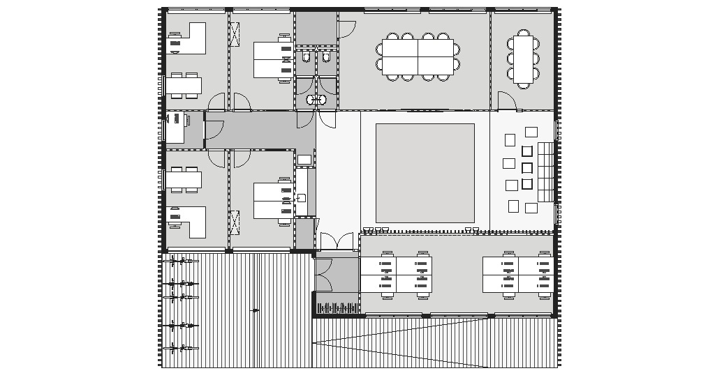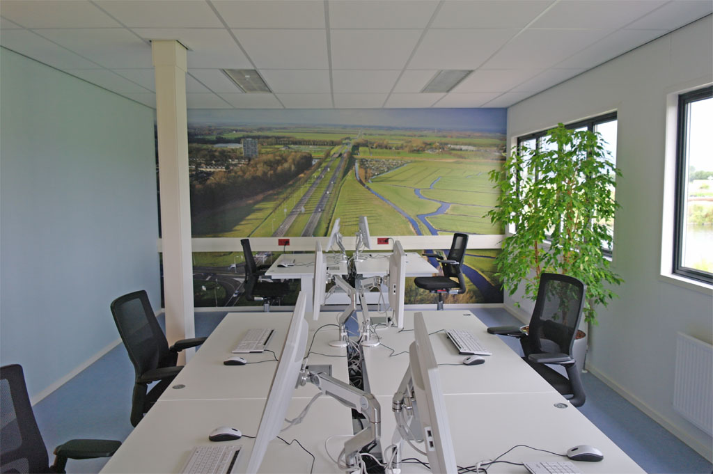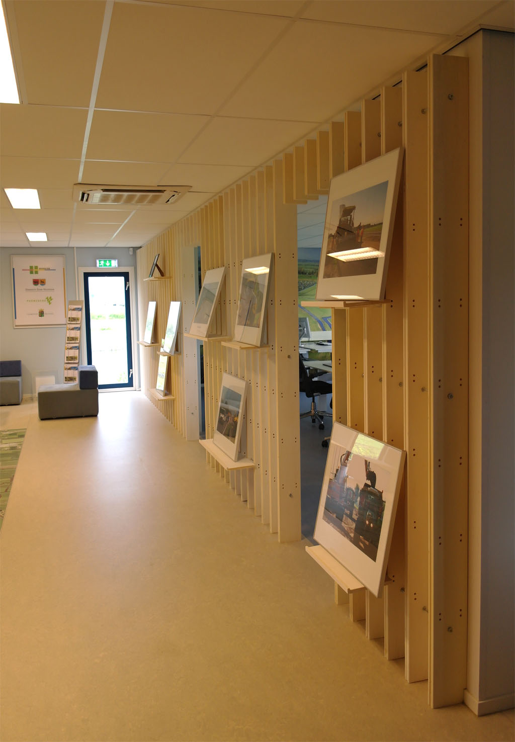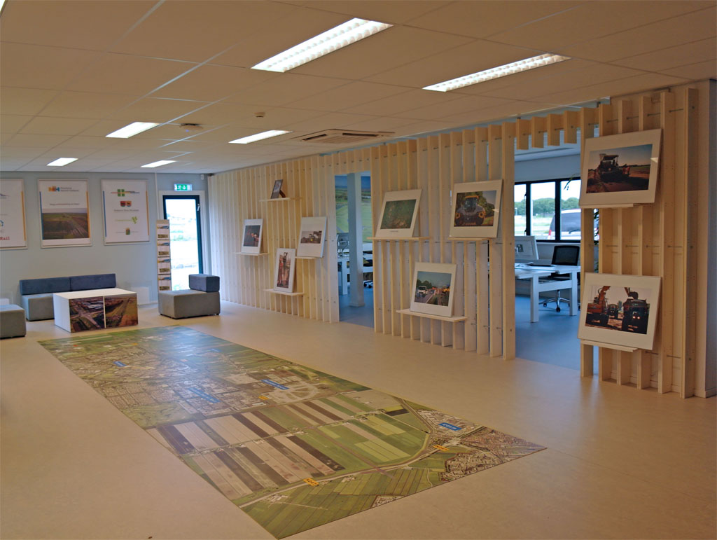 De lay-out van het bureau is georiënteerd rond de geprojecteerde weg in de centrale ruimte. Hier aan liggen de vergader en werk vertrekken waarin de flex-plekken worden gescheiden van de centrale ruimte middels een informatie wand die flexibel te gebruiken is om bezoekers te informeren. Het interieur bestaat uit duurzame materialen volgens het cradle to cradle principe. Het “centrale plein” verwijst naar de vierkante layout van de stolpboerderijen uit de omgeving, daar waar een ieder bijeenkomt en de informatie overdracht plaat vindt tussen burger en bestuurder.