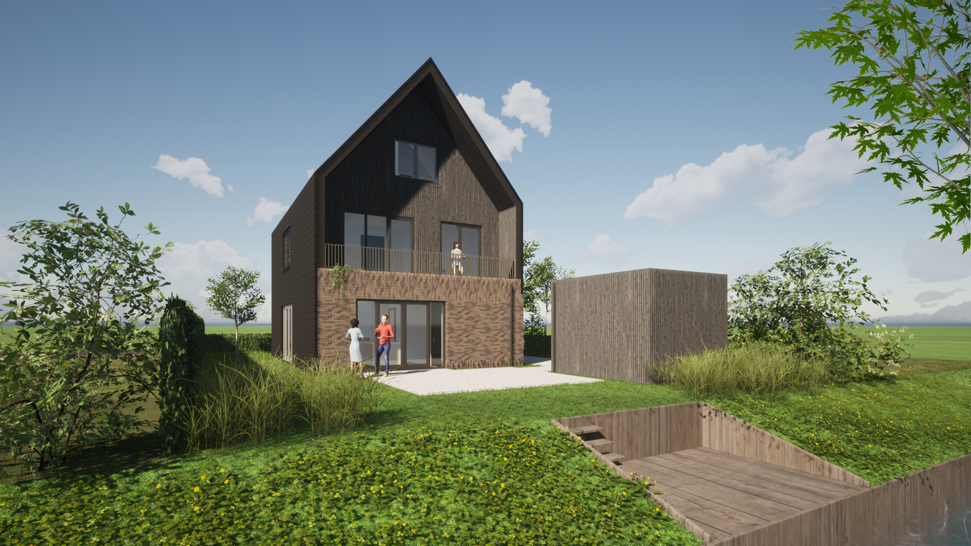 Aan het water op een fijne locatie komt deze vrijstaande stoere woning. De woning bestaat uit gemêleerd metselwerk refererend aan de aarde. Deze wordt afgedekt met lei pannen eveneens gemaakt uit klei als dak. Het entree steekt als stenen massa door deze schil heen. Aan de achterzijde wordt de massa ingedrukt en gevuld met een zacht materiaal, houten delen.