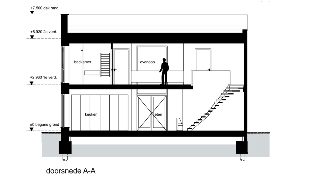 Het woonhuis kent een open – gesloten plattegrond. Door de woning heen is er overal contact mogelijk tussen de bewoners. De leefruimten staan over meerdere lagen in contact met elkaar en de grote vide zorgt voor veel daglicht en doorzicht in de woning. De plattegrond is zo ingedeeld dat er duidelijke plekken zijn voor functies die vloeiend in elkaar overlopen.