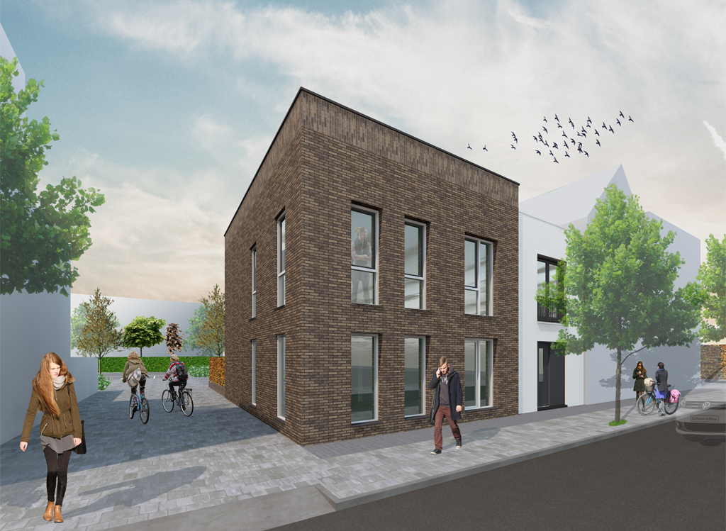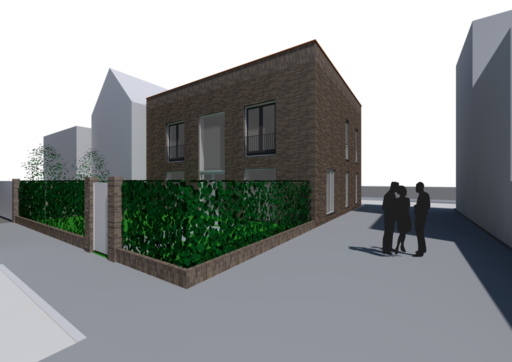 Dit resulteert in een liggend volume. Door de gevel te voorzien van twee afwerkingen, stucwerk en baksteen wordt het volume opgedeeld. Hierdoor ontstaan er optisch verticalen gevel delen met verschillende afwerkingen. Het metselwerk deel wordt verhoogd door de afscheiding te maken voor het te realiseren dakterras.